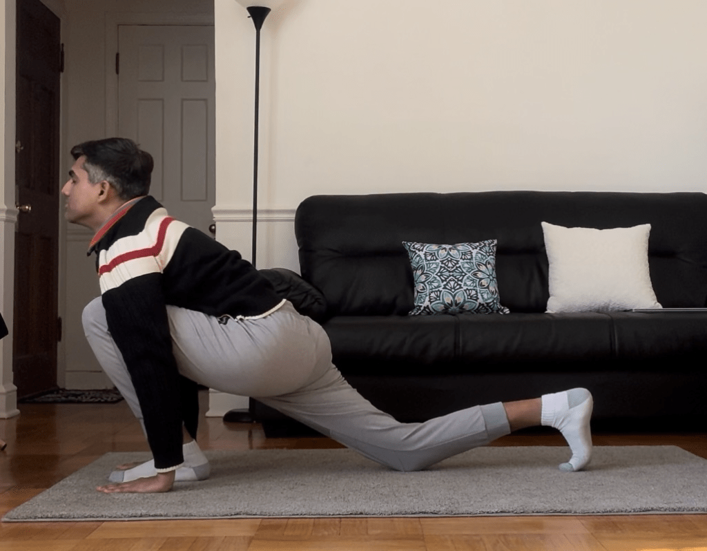 आता पुन्हा श्वास घेत उजवा पाय मागे न्यावा. फोटोत दाखवल्याप्रमाणे गुडघा जमिनीला स्पर्ष करेल आणि पायांची बोटं जमिनीकडे आणि टाच वर असेल. डावा पाय गुडघ्यातून वाकवून पुढे न्या, जेणेकरून गुडघा समोरच्या बाजूला असेल. हाताचे तळवे डाव्या पायाच्या बाजूला जमिनीवर ठेवा. डोकं थोडं मागच्या बाजूला झुकवावं. पाठीच्या बाजूला एक वक्राकार स्थिती तयार होईल. अश्व संचलनासनात पाठ आणि पायाच्या स्नायूंना चांगला स्ट्रेच मिळतो. या स्थितीत दोन भुवयांच्या मध्यभागी असलेल्या अज्ञा चक्रावर लक्ष केंद्रीत होतं. श्वास सामान्य असावा.