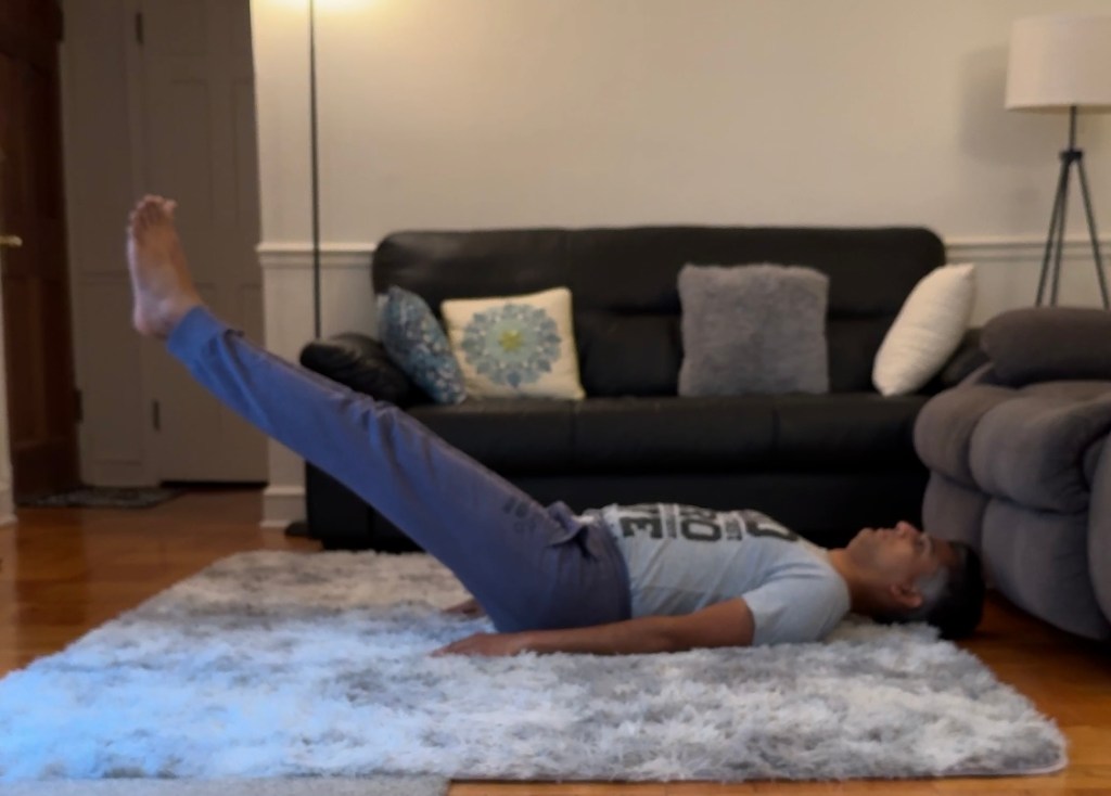 पुन्हा दिर्घ श्वास घ्या. त्यानंतर पाय हळूहळू वर उचला. पाय उचलताना ओटीपोटाच्या स्नायूंचा वापर करा. पोटाचे स्नायू आकुंचित करून पाय वर उचलण्याचा प्रयत्न करा. पाय एकत्र असूद्यात.